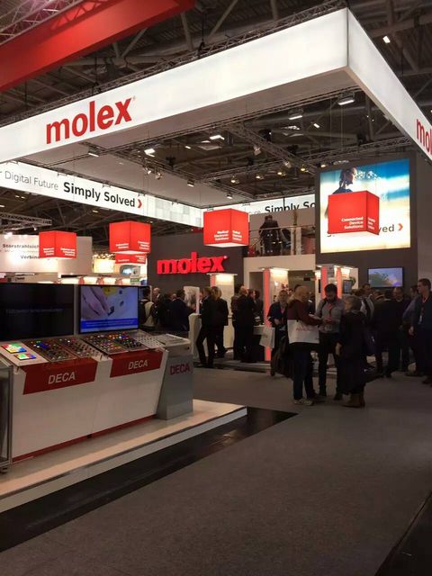 既然亞洲市場最大,為何慕尼黑electronica的展位最大,而不是亞洲例如上海的electronica? 首先因?yàn)榈聡嚇I(yè)發(fā)達(dá);另外展位功能上,慕尼黑展位的會議室多(注:Molex等很多展位搭建了二層,二樓設(shè)有會議室),適合客戶/分銷商來洽談溝通;再有,其他廠商展位規(guī)模都很大,Molex也水漲船高。