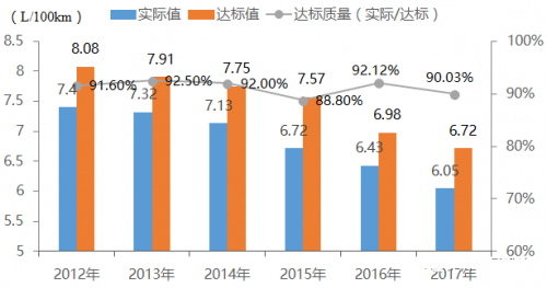 2017年傳統(tǒng)燃油車職業(yè)傳統(tǒng)車均勻燃料消耗量6.76L/100km,較2012年下半年年均下降1.8%。自主企業(yè)傳統(tǒng)燃油車油耗下降相對(duì)緩慢,全體高于職業(yè)均勻水平。